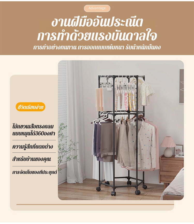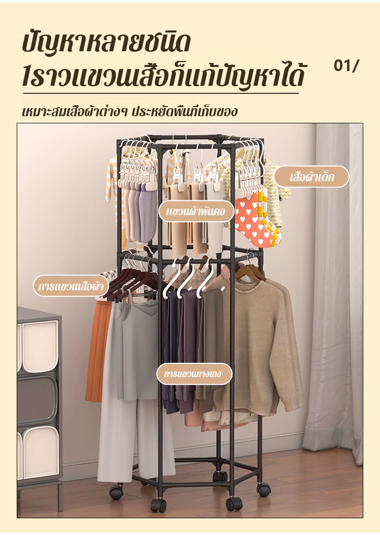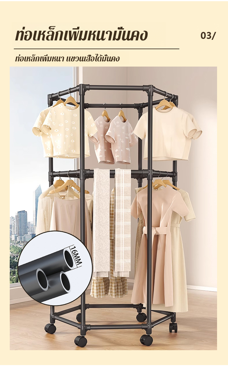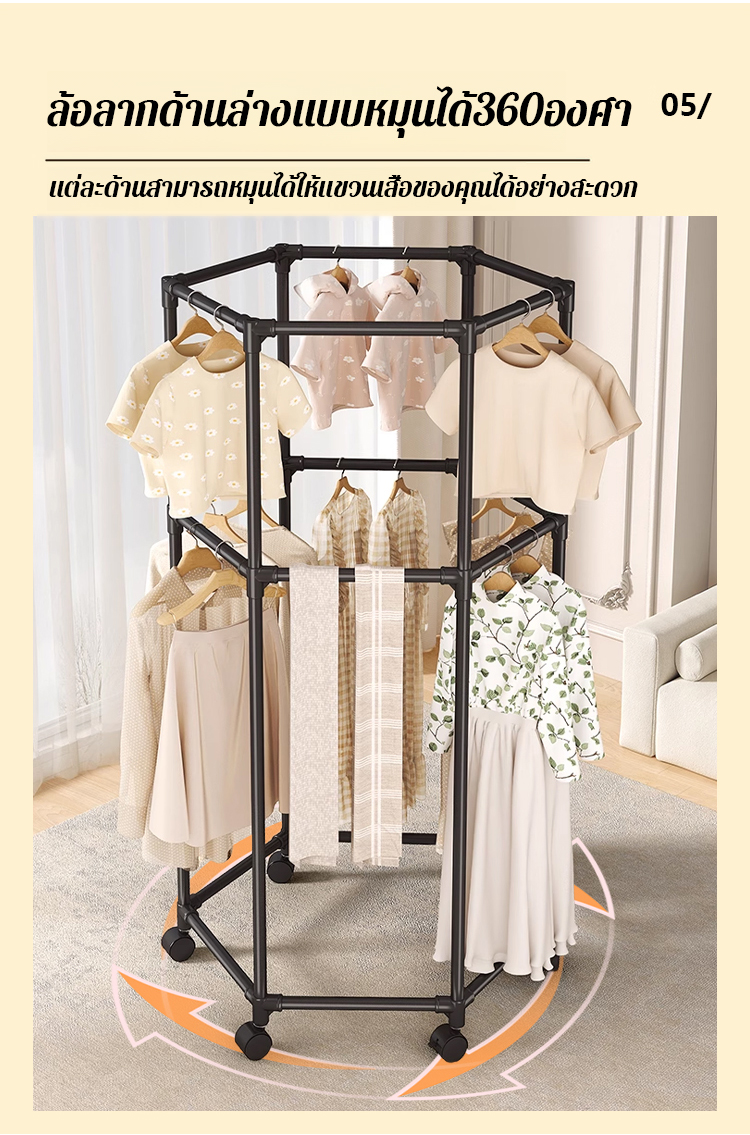 【สามารถแขวนเสื้อผ้าได้ทั้ง 6 ด้าน】 ราวแขวนผ้า 6เหลี่ยม สามารถหมุนได้ 360 องศา
